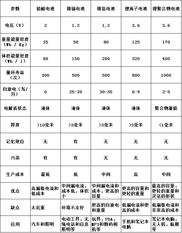 各種可充電電池的性能比較