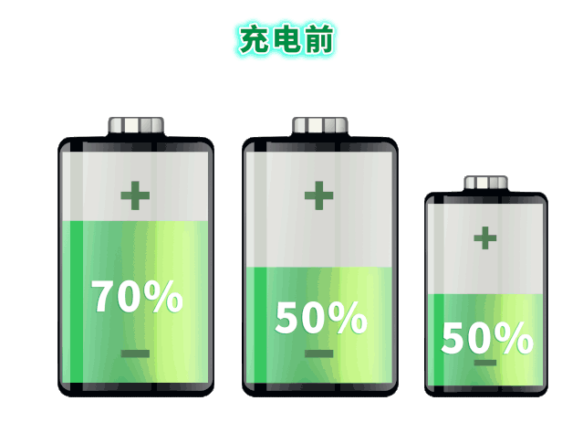 對于第一種情況,SOC一致,容量不一致。就好像一個碗的邊緣有了缺口,原本能裝50ml水,但現(xiàn)在只能裝40ml,否則就會從缺口漏出來。此時,容量小的最先充滿和放空,是整個電池包容量的瓶頸。我們想象一下,在充電前,三節(jié)容量不同的電芯他們的SOC是相同的,即當(dāng)前電量都是滿電電量的一半。