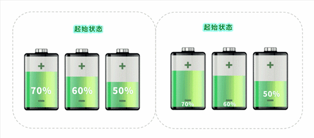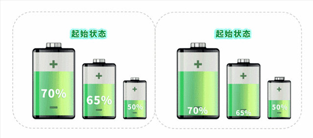 起始狀態(tài):容量相同的三節(jié)電芯,SOC當(dāng)前電量與滿電電量占比不一樣??梢园l(fā)現(xiàn),SOC最高的電芯最先充滿,SOC最低的電芯最先放空。而且此時只能停止充放電,以避免過充和過放行為發(fā)生。SOC最低的電芯是整個電池包容量的瓶頸。