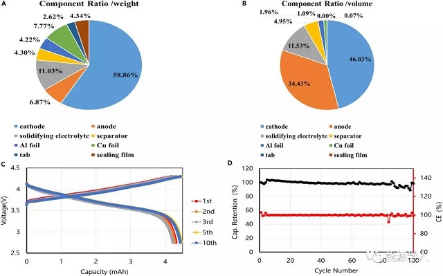 圖1. 真實Li/NCA軟包電池中各組分的重量、體積比及其電化學(xué)性能;(A)重量比,(B)體積比,(C 2.75–4.3V電壓下0.3C時的電池充放電曲線,(D)電池的容量保留率和庫倫效率。