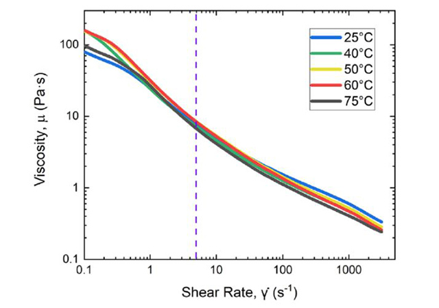 不同溫度下粘度-剪切速率流變曲線如圖5所示。溫度對粘度的影響可以分為兩個區(qū)域:低剪切速率粘度(LSV)和高剪切速率粘度(HSV)。在低剪切速率粘度(LSV)區(qū)域,從25℃到60 ℃范圍內,黏度隨溫度的升高而增加,但在75℃時黏度下降到25℃的水平。在高剪切速率粘度(HSV)區(qū)域,75℃時漿料具備更低的黏度。這些現(xiàn)象如前描述的聚合物與顆粒之間的鏈接相關。